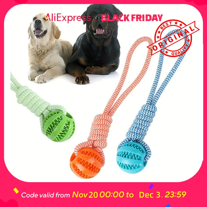 This interactive dog toy combines a tug rope, chew toy, and treat dispenser in one.